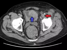 Phlegmasia cerulea dolens (PCD) [literally: painful blue inflammation; not to be confused with preceding phlegmasia alba dolens] is an uncommon severe form of lower extremity deep venous thrombosis (DVT) that obstructs venous outflow. Upper extremity PCD is less common, occuring in under 10% of all cases.[1] PCD results from extensive thrombotic occlusion (blockage by a thrombus) of extremity vein(s), most commonly an iliofemoral DVT of the iliac vein and/or common femoral vein.[2][3] It is a medical emergency requiring immediate evaluation and treatment.