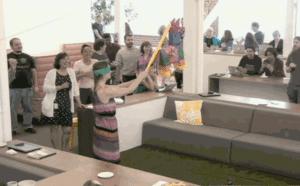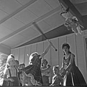 While the religious significance has been mostly lost, the ceremony that occurs with it has remained mostly intact. Piñatas remain most popular during Las Posadas with birthday parties coming in second. Each participant, usually a child, will have a turn at hitting the piñata, which is hung from above on a string. The participant is blindfolded, given a wooden stick, and then spun a number of times. As the participants works to hit the piñata, another moves it to make it harder to hit. There is a time limit to any one person's attempts, which is marked out by the singing of a traditional song.[1][9]