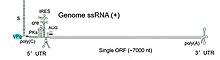 Picornaviruses are classed under Baltimore's viral classification system as group IV viruses as they contain a single stranded, positive sense RNA genome. Their genome ranges between 6.7 and 10.1 (kilobases) in length.[6] Like most positive sense RNA genomes, the genetic material alone is infectious; although substantially less virulent than if contained within the viral particle, the RNA can have increased infectivity when transfected into cells. The genome RNA is unusual because it has a protein on the 5' end that is used as a primer for transcription by RNA polymerase.This primer is called VPg genome range between 2–3 kb. VPg contain tyrosine residue at the 3’ end. Tyrosine as a –OH source for covalently linked to 5’ end of RNA.[8][10]
