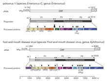 The polyprotein is organised as follows: L-1ABCD-2ABC-3ABCD with each letter representing a protein; however, there are variations to this layout.