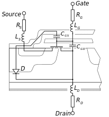 - RS is the source resistance. It represents all resistances between the source terminal of the package to the channel of the MOSFET: resistance of the wire bonds, of the source metallisation, and of the N+ wells;