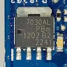 Two power MOSFETs in the surface-mount package D2PAK. Each of these components can sustain a blocking voltage of 120 volts and a continuous current of 30 amperes with appropriate heatsinking. | |