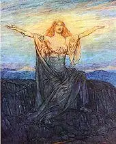 Celtic, Germanic and Slavic religions are recorded much later, and much more fragmentarily, than the religions of classical antiquity. They nevertheless show substantial parallels to the better-attested religions of the Iron Age. In the case of Germanic religion, the practice of prayer is reliably attested, but no actual liturgy is recorded from the early (Roman era) period. An Old Norse prayer is on record in the form of a dramatization in skaldic poetry. This prayer is recorded in stanzas 2 and 3 of the poem Sigrdrífumál, compiled in the 13th century Poetic Edda from earlier traditional sources, where the valkyrie Sigrdrífa prays to the gods and the earth after being woken by the hero Sigurd.[25] A prayer to Odin is mentioned in chapter 2 of the Völsunga saga where King Rerir prays for a child. In stanza 9 of the poem Oddrúnargrátr, a prayer is made to "kind wights, Frigg and Freyja, and many gods[26] In chapter 21 of Jómsvíkinga saga, wishing to turn the tide of the Battle of Hjörungavágr, Haakon Sigurdsson eventually finds his prayers answered by the goddesses Þorgerðr Hölgabrúðr and Irpa.[27] Folk religion in the medieval period produced syncretisms between pre-Christian and Christian traditions. An example is the 11th-century Anglo-Saxon charm Æcerbot for the fertility of crops and land, or the medical Wið færstice.[28] The 8th-century Wessobrunn Prayer has been proposed as a Christianized pagan prayer and compared to the pagan Völuspá[29] and the Merseburg Incantations, the latter recorded in the 9th or 10th century but of much older traditional origins.[30]