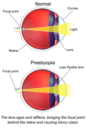 Presbyopia is a normal part of the aging process.[4] It occurs due to age related changes in lens (decreased elasticity and increased hardness) and ciliary muscle power of the eye, causing the eye to focus light behind rather than on the retina when looking at close objects.[4] It is a type of refractive error along with nearsightedness, farsightedness, and astigmatism.[4] Diagnosis is by an eye examination.[4]