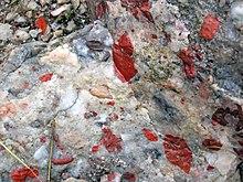 Jasper conglomerate, which is also denominated "pebble jasper conglomerate", "Saint Joseph Island puddingstone", "Drummond Island puddingstone", or "Michigan(ian) puddingstone", occurs in Saint Joseph Island and the vicinity of the Saint Mary's River, north and northwest of the Bruce Mines of Northern Ontario, Canada, circa 65 kilometres (40 mi) east of Sault Sainte Marie, Ontario. In these locales, it occurs as thick beds of Paleoproterozoic pebble conglomerate within the medial part of a geologic formation that is named the Lorrain Formation of the Cobalt Group. The jasper conglomerate consists of subrounded pebbles of red jasper, black chert, white quartzite, hematite, and semi-transparent quartz in a matrix of coarsely grained quartzite. It contains circa 30% to 90% of pebbles. Within the deposits of Lorrain Formation, the jasper conglomerates occur principally as the sedimentary fills of erosional troughs and channels of what are interpreted to be either alluvial fans or deposits of braided river.[10][11] These deposits are inferred to be nonglacial in origin and immediately postdate the Paleoproterozoic Makganyene glaciation.[12]