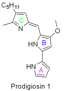 - ^ Hu, Dennis X. (2016). "Structure, Chemical Synthesis, and Biosynthesis of Prodiginine Natural Products". Chemical Reviews. 116: 7818–7853. doi:10.1021/acs.chemrev.6b00024. PMC 5555159. PMID 27314508.