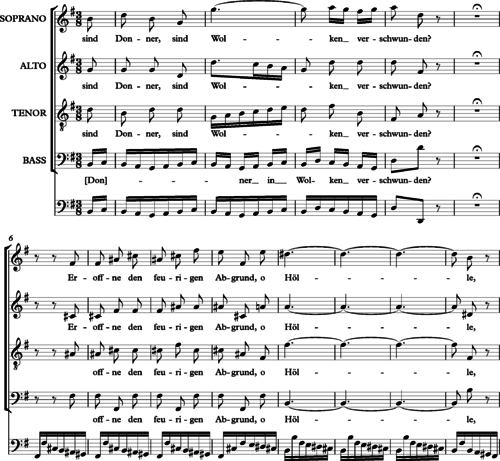 After the pause, the music continues to the words: "Open up the fiery bottomless pit, O hell!" The silence is intended to communicate a momentary sensation of terror, of staring into unfathomable darkness. Another example of a dramatic silence comes in the "rest full of tension" [11] at the climactic ending of the Hallelujah chorus in Handel’s Messiah: