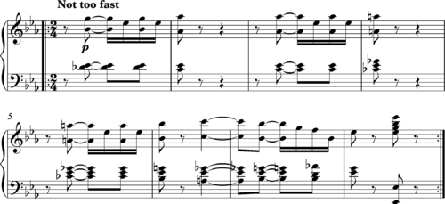 Early recordings[24] of the Rag Time Dance follow Joplin’s instructions as follows: "To get the desired effect of 'Stop Time', the pianist will please stamp the heel of one foot heavily upon the floor."[25] However, later recordings[26] disregard this direction – the regular beat is implied rather than stated and the silences are more palpable. Keith Swanwick (1979, p.70) is enchanted by the "playfulness and humour" engendered by the stop-time effects in Jelly Roll Morton's solo piano recording of The Crave (1939):[27] "If we listen to this, tapping or clicking along with the beat, we shalt find ourselves surprised by two patches of silence near the end. The beat goes on but the sound stops. The effect is something like being thrown forward when a car stops suddenly. It is the biggest surprise in an engaging piece of music full of little deviations (syncopations) from the repeated beat."[28]