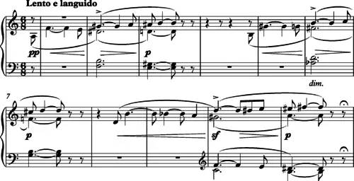During the 20th century, composers explored further the expressive potential of silence in their music.[17] The contemplative concluding bars of Anton Webern’s Symphony[18] (1928) and Stravinsky's Les Noces The Wedding, 1923)[19] make telling and atmospheric use of pauses. Eric Walter White (1947, p.74) describes the ending of Les Noces as follows: "As the voices cease singing, pools of silence come flooding in between the measured strokes of the bell chord, and the music dies away in a miraculously fresh and radiant close."[20]