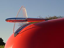 Hood ornaments are usually cast in brass, zinc, or bronze and finished in a chrome plated finish. During the years when chrome plate was unavailable, they were plated in either silver or nickel. Some also incorporated other materials, such as plastic, bakelite, or colored glass. The 1950 Ford Custom DeLuxe hood ornament was molded in Plexiglas.[24] Others incorporated a light bulb for illumination at night. Pontiac featured a lighted Indian-head hood ornament through 1955 when it was replaced by flying V design.[25]