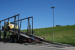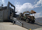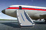 Inclined planes are widely used in the form of loading ramps to load and unload goods on trucks, ships and planes.[3] Wheelchair ramps are used to allow people in wheelchairs to get over vertical obstacles without exceeding their strength. Escalators and slanted conveyor belts are also forms of inclined plane.[6] In a funicular or cable railway a railroad car is pulled up a steep inclined plane using cables. Inclined planes also allow heavy fragile objects, including humans, to be safely lowered down a vertical distance by using the normal force of the plane to reduce the gravitational force. Aircraft evacuation slides allow people to rapidly and safely reach the ground from the height of a passenger airliner.