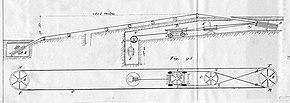 The term may also refer to a specific implementation; a straight ramp cut into a steep hillside for transporting goods up and down the hill. It may include cars on rails or pulled up by a cable system; a funicular or cable railway, such as the Johnstown Inclined Plane.
