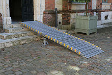 An inclined plane, also known as a ramp, is a flat supporting surface tilted at an angle, with one end higher than the other, used as an aid for raising or lowering a load.[1][2][3] The inclined plane is one of the six classical simple machines defined by Renaissance scientists. Inclined planes are widely used to move heavy loads over vertical obstacles; examples vary from a ramp used to load goods into a truck, to a person walking up a pedestrian ramp, to an automobile or railroad train climbing a grade.[3]
