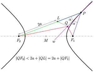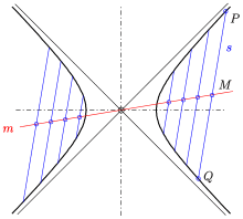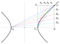 - For a pole outside the hyperbola the intersection points of its polar with the hyperbola are the tangency points of the two tangents passing (see diagram: ).