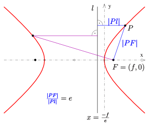 For an arbitrary point of the hyperbola the quotient of the distance to one focus and to the corresponding directrix (see diagram) is equal to the eccentricity: