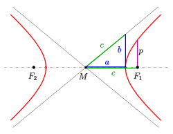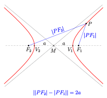 The midpoint of the line segment joining the foci is called the center of the hyperbola.[7] The line through the foci is called the major axis. It contains the vertices , which have distance to the center. The distance of the foci to the center is called the focal distance or linear eccentricity. The quotient is the eccentricity .