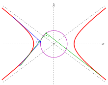 - The following are concurrent: (1) a circle passing through the hyperbola's foci and centered at the hyperbola's center; (2) either of the lines that are tangent to the hyperbola at the vertices; and (3) either of the asymptotes of the hyperbola.[23][24]