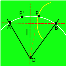 To prove this, reflect the line segment OP about the line obtaining the point P' as the image of P. Segment AP' has the same length as segment BP due to the reflection, while segment PP' has the same length as segment BP due to the eccentricity of the hyperbola. As OA, OP', OP and OB are all radii of the same circle (and so, have the same length), the triangles OAP', OPP' and OPB are all congruent. Therefore, the angle has been trisected, since 3×POB = AOB.[25]