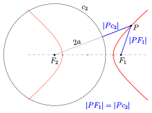 is called the circular directrix (related to focus ) of the hyperbola.[8][9] In order to get the left branch of the hyperbola, one has to use the circular directrix related to . This property should not be confused with the definition of a hyperbola with help of a directrix (line) below.