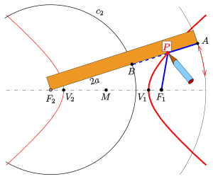 The definition of a hyperbola by its foci and its circular directrices (see above) can be used for drawing an arc of it with help of pins, a string and a ruler:[10]