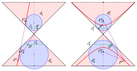 - The result is: is independent of the hyperbola point , because no matter where point is, have to be on circles , , and line segment has to cross the apex. Therefore, as point moves along the red curve (hyperbola), line segment simply rotates about apex without changing its length.