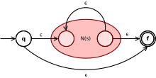 A regex processor translates a regular expression in the above syntax into an internal representation that can be executed and matched against a string representing the text being searched in. One possible approach is the Thompson's construction algorithm to construct a nondeterministic finite automaton (NFA), which is then made deterministic and the resulting deterministic finite automaton (DFA) is run on the target text string to recognize substrings that match the regular expression. The picture shows the NFA scheme N(s*) obtained from the regular expression s*, where s denotes a simpler regular expression in turn, which has already been recursively translated to the NFA N(s).