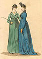 When high waists were the fashion, from roughly 1790 to 1820, the habit could be a coat dress called a riding coat (borrowed in French as redingote) or a petticoat with a short jacket (often longer in back than in front).