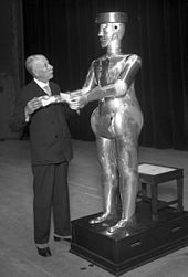 Westinghouse Electric Corporation built Televox in 1926; it was a cardboard cutout connected to various devices which users could turn on and off. In 1939, the humanoid robot known as Elektro was debuted at the 1939 New York World's Fair.[53][54] Seven feet tall (2.1 m) and weighing 265 pounds (120.2 kg), it could walk by voice command, speak about 700 words (using a 78-rpm record player), smoke cigarettes, blow up balloons, and move its head and arms. The body consisted of a steel gear, cam and motor skeleton covered by an aluminum skin. In 1928, Japan's first robot, Gakutensoku, was designed and constructed by biologist Makoto Nishimura.