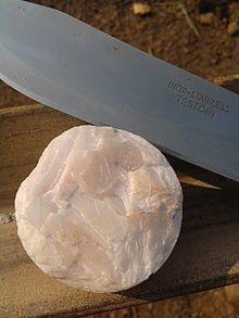 Quartz is the most common material identified as the mystical substance maban in Australian Aboriginal mythology. It is found regularly in passage tomb cemeteries in Europe in a burial context, such as Newgrange or Carrowmore in Ireland. The Irish word for quartz is grianchloch, which means 'sunstone'. Quartz was also used in Prehistoric Ireland, as well as many other countries, for stone tools; both vein quartz and rock crystal were knapped as part of the lithic technology of the prehistoric peoples.[27]