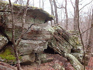 On Ordnance Survey maps in Great Britain, cliffs are distinguished from outcrops: cliffs have a continuous line along the top edge with lines protruding down; outcrops have a continuous line around each area of bare rock. An outcrop example in California is the Vasquez Rocks, familiar from location shooting use in many films, composed of uplifted sandstone.[2][3] Yana is another example of outcrops, located in Uttara Kannada district in Karnataka, India.