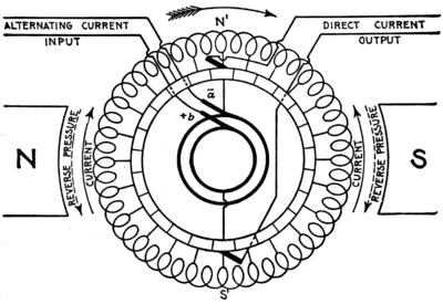 - If a direct current is applied to the commutator, the coil will begin to rotate as a commutated electric motor and an alternating current can be taken out of the collector rings. This is called an inverted rotary converter (see Inverter).