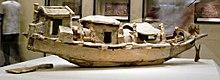 The world's oldest known depiction of a sternpost-mounted rudder can be seen on a pottery model of a Chinese junk dating from the 1st century AD during the Han Dynasty, predating their appearance in the West by a thousand years.[7][10][32] In China, miniature models of ships that feature steering oars have been dated to the Warring States period (c. 475–221 BC).[7] Sternpost-mounted rudders started to appear on Chinese ship models starting in the 1st century AD.[7] However, the Chinese continued to use the steering oar long after they invented the rudder, since the steering oar still had limited practical use for inland rapid-river travel.[10] One of oldest known depiction of a stern-mounted rudder in China can be seen on a 2-foot-long tomb pottery model of a junk dating from the 1st century AD, during the Han Dynasty (202 BC-220 AD).[8][33] It was discovered in Guangzhou in an archaeological excavation carried out by the Guangdong Provincial Museum and Academia Sinica of Taiwan in 1958.[8][33] Within decades, several other Han Dynasty ship models featuring rudders were found in archaeological excavations.[34] The first solid written reference to the use of a rudder without a steering oar dates to the 5th century.[32]
