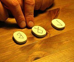 Other oft cited sources for the practice of runic divination are chapter 38 of Snorri Sturluson's Ynglinga Saga, where Granmar, the king of Södermanland, travels to the Temple at Uppsala for the seasonal blót. "There, the chips fell in a way that said that he would not live long" (Féll honum þá svo spánn sem hann mundi eigi lengi lifa).[10]