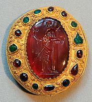 The red variety of chalcedony has been known to be used as beads since the Early Neolithic in Bulgaria. The first faceted (with constant 16+16=32 facets on each side of the bead) carnelian beads are described from the Varna Chalcolithic necropolis (middle of the 5th millennium BC).[3] The bow drill was used to drill holes into carnelian in Mehrgarh in the 4th-5th millennium BC.[4] Carnelian was recovered from Bronze Age Minoan layers at Knossos on Crete in a form that demonstrated its use in decorative arts;[5] this use dates to approximately 1800 BC. Carnelian was used widely during Roman times to make engraved gems for signet or seal rings for imprinting a seal with wax on correspondence or other important documents. Hot wax does not stick to carnelian.[6] Sard was used for Assyrian cylinder seals, Egyptian and Phoenician scarabs, and early Greek and Etruscan gems.[7] The Hebrew odem (also translated sardius), the first stone in the High Priest's breastplate, was a red stone, probably sard but perhaps red jasper.[7] In Revelation 4:3, the One seated on the heavenly throne seen in the vision of John the apostle is said to "look like jasper and 'σαρδίῳ' (sardius transliterated)." And likewise it is in Revelation 21:20 as one of the precious stones in the foundations of the wall of the heavenly city.[8]
