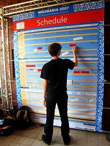 A schedule or a timetable, as a basic time-management tool, consists of a list of times at which possible tasks, events, or actions are intended to take place, or of a sequence of events in the chronological order in which such things are intended to take place. The process of creating a schedule — deciding how to order these tasks and how to commit resources between the variety of possible tasks — is called scheduling,[1][2] and a person responsible for making a particular schedule may be called a scheduler. Making and following schedules is an ancient human activity.[3]