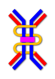 Schematic of immunoglobulin A dimer showing H-chain (blue), L-chain (red), J-chain (magenta) and secretory component (yellow).