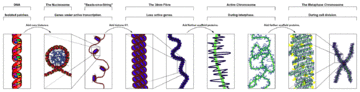 - Metaphase: The metaphase structure of chromatin differs vastly to that of interphase. It is optimised for physical strength and manageability, forming the classic chromosome structure seen in karyotypes. The structure of the condensed chromatin is thought to be loops of 30 nm fibre to a central scaffold of proteins. It is, however, not well-characterised. Chromosome scaffolds play an important role to hold the chromatin into compact chromosomes. Loops of 30 nm structure further condense with scaffold, into higher order structures.[12] Chromosome scaffolds are made of proteins including condensin, type IIA topoisomerase and kinesin family member 4 (KIF4).[13] The physical strength of chromatin is vital for this stage of division to prevent shear damage to the DNA as the daughter chromosomes are separated. To maximise strength the composition of the chromatin changes as it approaches the centromere, primarily through alternative histone H1 analogues. During mitosis, although most of the chromatin is tightly compacted, there are small regions that are not as tightly compacted. These regions often correspond to promoter regions of genes that were active in that cell type prior to chromatin formation. The lack of compaction of these regions is called bookmarking, which is an epigenetic mechanism believed to be important for transmitting to daughter cells the "memory" of which genes were active prior to entry into mitosis.[14] This bookmarking mechanism is needed to help transmit this memory because transcription ceases during mitosis.