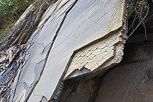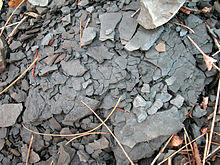 Shale typically exhibits varying degrees of fissility, breaking into thin layers, often splintery and usually parallel to the otherwise indistinguishable bedding plane because of the parallel orientation of clay mineral flakes.[1] Non-fissile rocks of similar composition but made of particles smaller than 0.06 mm are described as mudstones (1/3 to 2/3 silt particles) or claystones (less than 1/3 silt). Rocks with similar particle sizes but with less clay (greater than 2/3 silt) and therefore grittier are siltstones.[1][2]