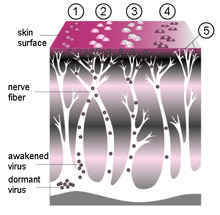 Unless the immune system is compromised, it suppresses reactivation of the virus and prevents shingles outbreaks. Why this suppression sometimes fails is poorly understood,[37] but shingles is more likely to occur in people whose immune systems are impaired due to aging, immunosuppressive therapy, psychological stress, or other factors.[38][39] Upon reactivation, the virus replicates in neuronal cell bodies, and virions are shed from the cells and carried down the axons to the area of skin innervated by that ganglion. In the skin, the virus causes local inflammation and blistering. The short- and long-term pain caused by shingles outbreaks originates from inflammation of affected nerves due to the widespread growth of the virus in those areas.[40]