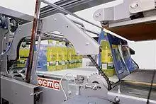 Shrink wrap is applied over or around the intended item, often by automated equipment. It is then heated by a heat gun or sent through a shrink tunnel or oven for shrinking.