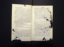 Silverfish are able to digest cellulose by themselves, thanks to the cellulase that is produced by its midgut.[9] They consume matter that contains polysaccharides, such as starches and dextrin in adhesives.[4] These include book bindings, carpet, clothing, coffee, dandruff, glue, hair, some paints, paper, photos, plaster, and sugar. They will damage wallpaper in order to consume the paste.[17] Silverfish can also cause damage to tapestries. Other substances they may eat include cotton, dead insects, linen, silk, leftover crumbs, or even their own exuviae (moulted exoskeleton). During famine, a silverfish may even consume leatherware and synthetic fabrics. Silverfish can live for a year or more without eating if water is available.[2][4][18]