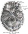 The transverse sinuses (left and right lateral sinuses), within the human head, are two areas beneath the brain which allow blood to drain from the back of the head. They run laterally in a groove along the interior surface of the occipital bone. They drain from the confluence of sinuses (by the internal occipital protuberance) to the sigmoid sinuses, which ultimately connect to the internal jugular vein. See diagram (at right): labeled under the brain as "SIN. TRANS." (for Latin: sinus transversus).