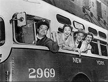 The Honeymooners debuted as a half-hour series on 1955 and was originally aired on the DuMont network's Cavalcade of Stars and subsequently on the CBS network's The Jackie Gleason Show,[42] which was filmed in front of a live audience. Although initially a ratings success—becoming the No. 2 show in the United States during its first season—it faced stiff competition from The Perry Como Show,[43][44] and eventually dropped to No. 19,[44][45] ending its production after only 39 episodes (now referred to as the "Classic 39"). The final episode of The Honeymooners aired on September 22, 1956. Creator/producer Jackie Gleason revived The Honeymooners sporadically until 1978. The Honeymooners was one of the first U.S. television shows to portray working class married couples in a gritty, non-idyllic manner (the show is set mostly in the Kramdens' kitchen, in a neglected Brooklyn apartment building).[46] Steven Sheehan explains the popularity of The Honeymooners as the embodiment of working-class masculinity in the character of Ralph Kramden, and postwar ideals in American society regarding work, housing, consumerism, and consumer satisfaction. The series demonstrated visually the burdens of material obligations and participation in consumer culture, as well as the common use of threats of domestic violence in working class households.[47] Art Carney won five Emmy Awards for his portrayal of Ed Norton — two for the original Jackie Gleason Show, one for The Honeymooners, and two for the final version of The Jackie Gleason Show. He was nominated for another two (1957, 1966) but lost. Gleason and Audrey Meadows were both nominated in 1956 for their work on The Honeymooners. Meadows was also nominated for Emmys for her portrayal of Alice Kramden in 1954 and 1957.[48][49] In 1997, the episodes "The $99,000 Answer" and "TV or Not TV" were respectively ranked No. 6 and No. 26 on "TV Guide's 100 Greatest Episodes of All Time"[50] and in 1999, TV Guide published a list titled "TV's 100 Greatest Characters Ever!" Ed Norton was No. 20, and Ralph Kramden was No. 2.[51] In 2002, The Honeymooners was listed at No. 3 on TV Guide's 50 Greatest TV Shows of All Time and No. 13 on their list of the "60 Greatest Shows of All Time" in 2013.[52]