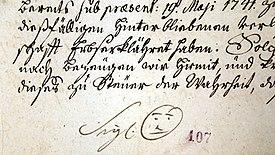 Signature of Bernard Hennet, Abbot of Žďár nad Sázavou Cistercian cloister, in 1741, with smiley-like drawing