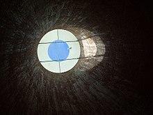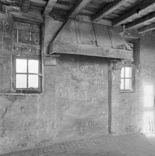 Industrial chimney use dates to the Romans, who drew smoke from their bakeries with tubes embedded in the walls. However, domestic chimneys first appeared in large dwellings in northern Europe in the 12th century. The earliest extant example of an English chimney is at the keep of Conisbrough Castle in Yorkshire, which dates from 1185 AD.[3] However, they did not become common in houses until the 16th and 17th centuries.[4] Smoke hoods were an early method of collecting the smoke into a chimney (see image). Another step in the development of chimneys was the use of built in ovens which allowed the household to bake at home. Industrial chimneys became common in the late 18th century.