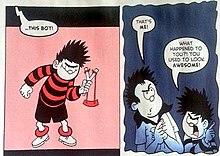 BBC News once called Dennis the 'definitive naughty boy'. Matthew Jarron of Dundee University, curator of a Beano exhibition, claimed that the strips 'blatant anti-establishment tone' is what keeps children entertained throughout the decades. Children's author and political columnist Michael Rosen said he enjoyed the prospect that 'In most children's books a bad child gets made good. But the great thing about Dennis is he never gets better'.[1] Nick Newman cited his inspiration for a Private Eye strip based on the Menace due to the fact Dennis is 'relentless' and has 'no learning curve'. Jarron also argued that Dennis offers a sense of escapism in a modern cotton wool wrapped world stating 'Parents are so fearful of letting their children roam around. So Dennis can provide that vicarious pleasure of going out and doing anything. And it's menacing of a pretty benign kind'.[15] Express called Dennis 'the child template for every post-war rebel without a cause'.[16] John McShane, a comic historian further praised the strip calling Dennis 'an original looking character. In the early days it was not in full colour but had a red overlay, but Davy Law, the artist, made a virtue out of this necessity by having the red-and-black striped T-shirt. The mantra in design classes is: 'Black and Red will always be read.' And that spiky hair! Unforgettable. Then that cheeky expression. Cartoonists talk about drawings just 'coming right'; that expression is perfect. Dennis is not actually evil ... Dennis just wants fun and is prepared to accept the consequences'.[17]