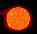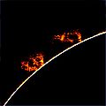 When a prominence is viewed from a different perspective so that it is against the Sun's disk instead of against space, it appears darker than the background. This formation is instead called a solar filament.[1] It is possible for a projection to be both a filament and a prominence. Some prominences are so powerful that they throw out matter from the Sun into space at speeds ranging from 600 km/s to more than 1000 km/s. Other prominences form huge loops or arching columns of glowing gases over sunspots that can reach heights of hundreds of thousands of kilometers. Prominences may last for a few days or even for a few months.[4]
