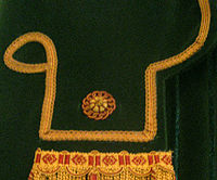 Soutache (/suːˈtæʃ/, soo-TASH), also known as Russia braid,[1] is a narrow flat decorative braid, a type of galloon, used in the trimming of drapery or clothing. Soutache is created by weaving a decorative thread around and between two parallel cords and completely covering the cores; this produces a piece of trim with a braided or herringbone pattern.[2] Often woven of metallic bullion thread, silk, or a blend of silk and wool,[3] soutache began to be made of rayon and other synthetic fibers in the 20th century.