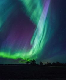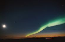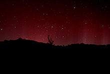David Malin pioneered multiple exposure using multiple filters for astronomical photography, recombining the images in the laboratory to recreate the visual display more accurately.[20] For scientific research, proxies are often used, such as ultraviolet, and color-correction to simulate the appearance to humans. Predictive techniques are also used, to indicate the extent of the display, a highly useful tool for aurora hunters.[21] Terrestrial features often find their way into aurora images, making them more accessible and more likely to be published by major websites.[22] Excellent images are possible with standard film (using ISO ratings between 100 and 400) and a single-lens reflex camera with full aperture, a fast lens (f1.4 50 mm, for example), and exposures between 10 and 30 seconds, depending on the aurora's brightness.[23]