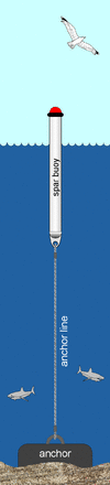 A spar buoy is a tall, thin buoy that floats upright in the water and is characterized by a small water plane area and a large mass. Because they tend to be stable ocean platforms, spar buoys are popular for making oceanographic measurements. Adjustment of the water plane area and the mass allows spar buoys to be tuned so they tend to not respond to wave forcing.[1] This characteristic differentiates them from large water plane area buoys[2] such as discus buoys that tend to be wave followers. Spar buoys are often used as stable platforms for wave measurement devices[3] and air–sea interaction measurements.[4] Spar buoys range in length from a few feet[5] to the 354-foot (108 meter) RP FLIP. To avoid the difficulties inherent with shipboard launch and recovery, helicopter deployment of large spar buoys has been studied.[6]